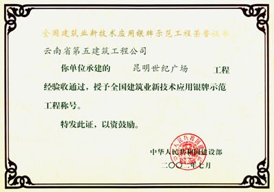世紀(jì)廣場(chǎng)銀牌示范工程證書